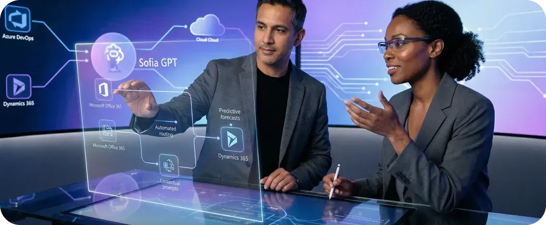 We enable ecosystem integration on the Microsoft cloud, leveraging native capabilities with Office 365, Dynamics 365, and Azure DevOps. Our experts activate Sofia GPT to drive time-saving automation, improve forecasting accuracy and gain personalized assistance.