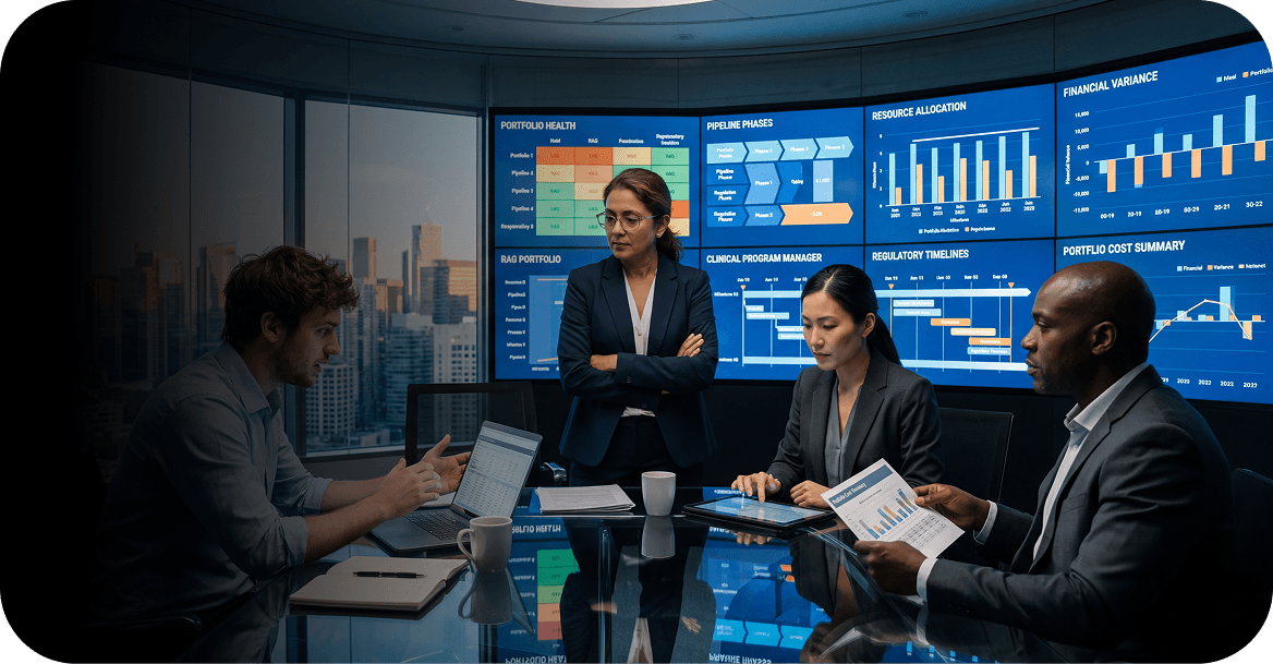 Well-designed data analytics in project management is no longer a reporting convenience. It is a strategic control tower for project portfolio performance. In complex organizations, where capital allocation, resource constraints, and regulatory pressures intersect, decision velocity depends on real-time visibility. Without a structured PMO project tracking dashboard, portfolio discussions rely on fragmented spreadsheets, static presentations, and subjective updates.For PMO leaders and senior project professionals, the question is not whether to implement a dashboard, but how to design one that scales governance and enables strategic alignment. A mature PMO dashboard connects execution data to business outcomes, making portfolio trade-offs transparent and defensible. It transforms status reporting into performance management.What Is a PMO Dashboard?A PMO dashboard is a structured, visual decision-support layer that consolidates project, financial, risk, and resource data into actionable portfolio insights.In a pharma R&D context, a dashboard must:Integrate clinical, financial, and strategic dataReflect phase-gated development realitiesIncorporate Probability of Technical and Regulatory Success (PTRS)Present risk-adjusted financial metrics (e.g., rNPV)Enable scenario modelingUnlike traditional project dashboards focused on schedule and budget, an R&D PMO dashboard must support questions such as:Where should we allocate the next $100M?Which asset creates concentration risk?What is the impact of accelerating Phase II by 6 months?Are we over-indexed in early-stage assets?Are we realizing the intended benefits?Operational dashboards focus on day-to-day execution. They highlight schedule variance, cost variance, milestone adherence, issue logs, and resource utilization. These views are often used by project managers and program leads to monitor delivery discipline.Executive-level dashboards operate at different altitudes. They aggregate portfolio-level KPIs, investment distribution, strategic alignment scores, benefit realization trends, and risk exposure summaries. Their purpose is not task tracking, but investment governance and performance oversight.A robust PMO dashboard integrates data from Project Portfolio Management (PPM) systems, financial systems, timesheets, and risk registers. The outcome is a single source of truth for portfolio performance, enabling consistent conversations across leadership forums.The 10 Important pharma Dashboards Every PMO n life sciences Should HaveThe following dashboards were selected based on three criteria: executive relevance, R&D specificity, and measurability. Each supports distinct governance decisions and should be integrated into a coherent portfolio reporting framework.Portfolio Investment Allocation DashboardObjective: The Portfolio Investment Allocation Dashboard helps ensure that financial and strategic resources are distributed optimally across a pharma R&D portfolio. It enables the PMO and executives to monitor whether investments align with therapeutic priorities, risk appetite, and long-term pipeline strategy. By visualizing capital allocation across modalities, phases, and internal versus partnered assets, it highlights areas of over- or under-investment. This dashboard also supports scenario-based reallocation decisions to maximize portfolio value while managing concentration risk.Key KPIs to Monitor:Budget vs. Actual Spend by therapeutic area, development phase, and modalityAllocation Across Phases (Discovery → Phase I–III → Regulatory)Internal vs. Partnered Asset Investment RatioRisk-Adjusted Investment Distribution (e.g., rNPV-weighted allocation)Concentration Risk Index (exposure to top 3–5 assets) 2. Clinical Milestone Performance DashboardObjective: The Clinical Milestone Performance Dashboard tracks the operational execution of clinical trials to ensure that studies progress on schedule and within defined parameters. It provides visibility into enrollment, site activation, and critical path timelines, helping PMOs identify delays or bottlenecks early. By monitoring milestone adherence across the portfolio, it allows leaders to assess program predictability and take corrective actions to avoid downstream impacts on time-to-market and overall portfolio value. This dashboard also supports scenario analysis for risk mitigation and resource planning in ongoing trials.Key KPIs to Monitor:Enrollment Velocity vs. Planned Targets (patients recruited per site over time)First Patient In (FPI) / Last Patient Out (LPO) VarianceSite Activation Timelines (planned vs. actual)Critical Path Slippage (deviation from projected milestones)Trial Completion Probability or PTRS-based Milestone Status3. Resource Capacity & Utilization DashboardObjective: The Resource Capacity & Utilization Dashboard helps PMOs ensure that human and operational resources are optimally allocated across the R&D portfolio. It provides visibility into functional workloads, skill availability, and potential bottlenecks, enabling proactive adjustments before delays occur. By monitoring both internal teams and outsourced resources, the dashboard ensures projects are adequately staffed and aligned with strategic priorities. It also supports scenario planning, helping executives assess the impact of shifting resources between high-value or time-sensitive projects.Key KPIs to Monitor:FTE Demand vs. Capacity by function (clinical operations, biostatistics, regulatory, etc.)Resource Utilization Rate (percentage of available hours allocated to active projects)Skill Gap Heatmaps (identifying critical resource shortages)Outsourcing vs. Internal Resource MixOvercommitment Index (projects exceeding available capacity)4. Risk and Issue Management DashboardObjective: The Risk and Issue Management Dashboard provide a centralized view of potential and ongoing risks across the R&D portfolio, helping PMOs proactively identify, assess, and mitigate threats to project timelines, costs, and ou